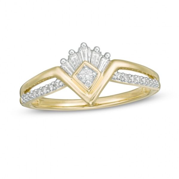 Crafted in warm 10K gold, this princess-perfect piece features a brilliant diamond in a kite-shaped frame and topped with a row of baguette-cut diamonds – all set in a “V”-shaped center. The double-row split-prong setting gleams with a polished and diamond-rimmed ribbon, completing the tiara-like look. This ring features a 1/5 carat diamond that is polished to a dazzling shine.