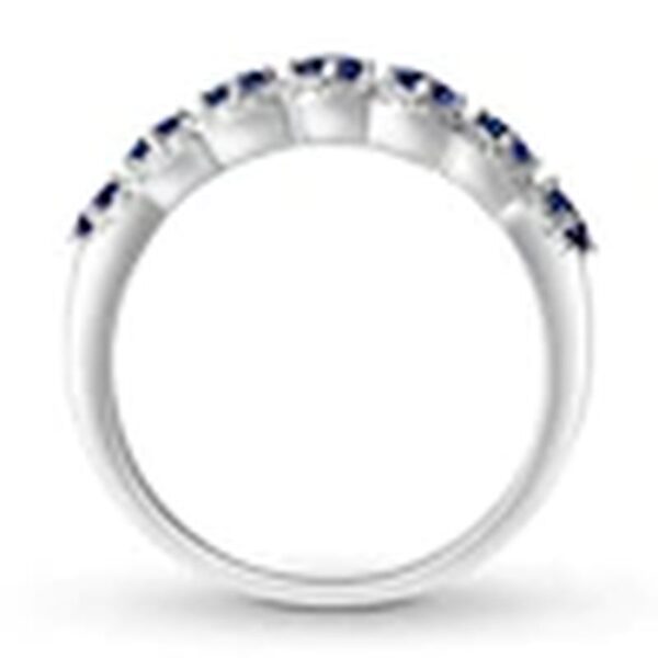 Square-cut natural sapphires are traced in sparkling curves of round diamonds in this stunning anniversary band. The ring is crafted of polished 10K white gold and has a total diamond weight of 1/4 carat.Item #: 533042901Content + CareSapphire is commonly subjected to enhancement processes or treatments such as heating and diffusion. Gently clean by rinsing in warm water and drying with a soft cloth.