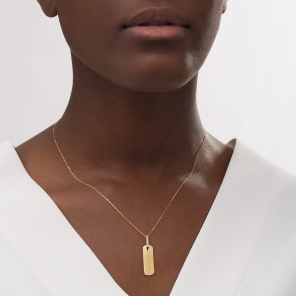 Wear your values with pride with this statement-making diamond pendant. Crafted in warm 10K gold, this petite tag features the word inscribed vertically along the center. Diamonds line the bail for a hint of sparkle. Captivating with 1/20 ct. t.w. of diamonds and a bright polished shine, this pendant suspends along a 16.0-inch cable chain with 2.0-inch extender that secures with a spring-ring clasp. This exclusive fine jewelry collection inspires you to wear your strength, confidence and power.