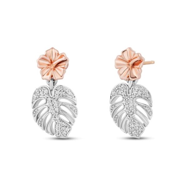 Featuring a tropical design, these earrings feature 10K rose gold hibiscus flowers shimmering on the posts while glittering round diamonds sparkle on the dangling leaves. The earrings have a total diamond weight of 1/10 carat and are secured with a friction back.