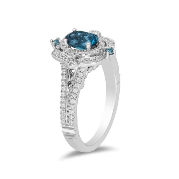 She’ll love every charming flourish of this divine gemstone and diamond engagement ring. Fashioned in 14K white gold, this design showcases a 7.0 x 5.0mm 70th oval-shaped London blue topaz wrapped in a diamond halo. Adding elegant detail, diamonds and a pair of round London blue topaz adorn the ornate outer frame. The diamond-lined lends further sparkle while crown insets lower down denote a princess-worthy style. Underneath the centerpiece, diamonds dot a scrolling carriage motif. Captivating with 1/4 ct. t.w. of diamonds and a bright polished shine, this engagement ring makes all her dreams come true.A Certificate of Authenticity accompanies this collector’s edition piece.